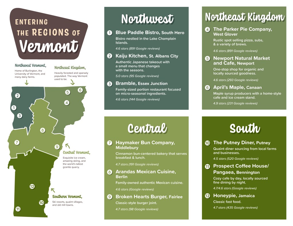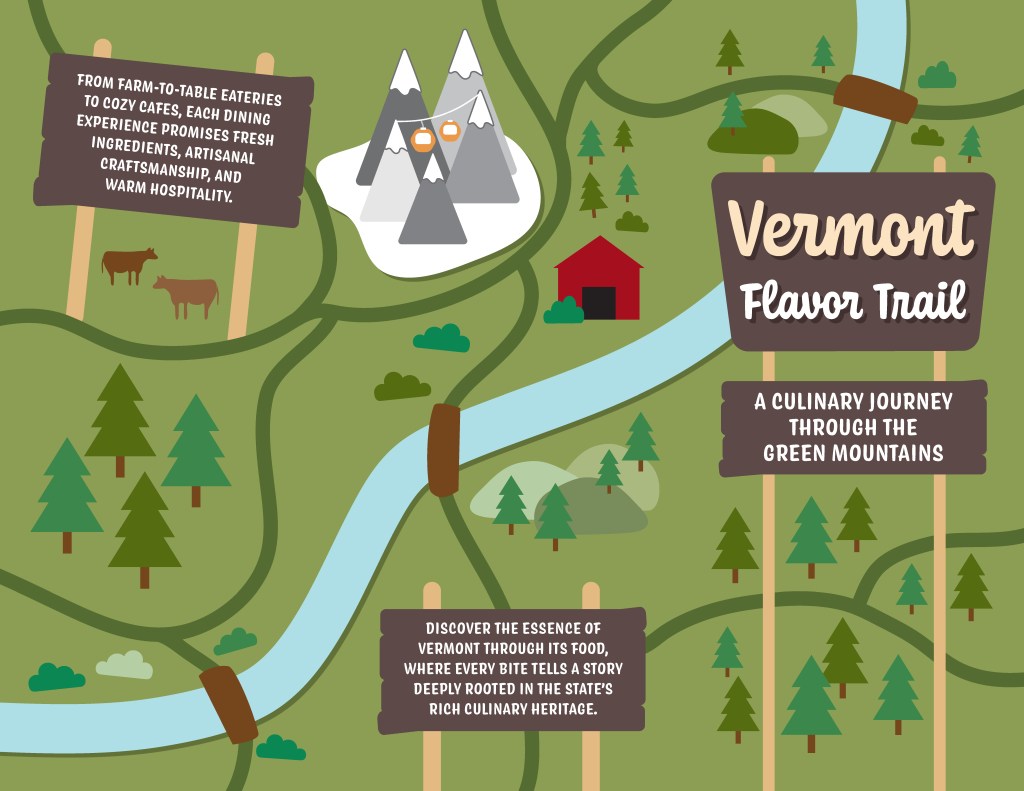 The Vermont Flavor Trail brochure invites readers on a culinary journey through the Green Mountains, highlighting local dining gems across the state. Featuring hand-drawn map elements and a vibrant design, it blends visual charm with informative content, showcasing regional specialties and must-visit eateries. With a focus on farm-to-table experiences and the rich culinary heritage of Vermont, the brochure captures the essence of the state’s flavors while guiding food lovers to unforgettable destinations. Created for a course assignment.