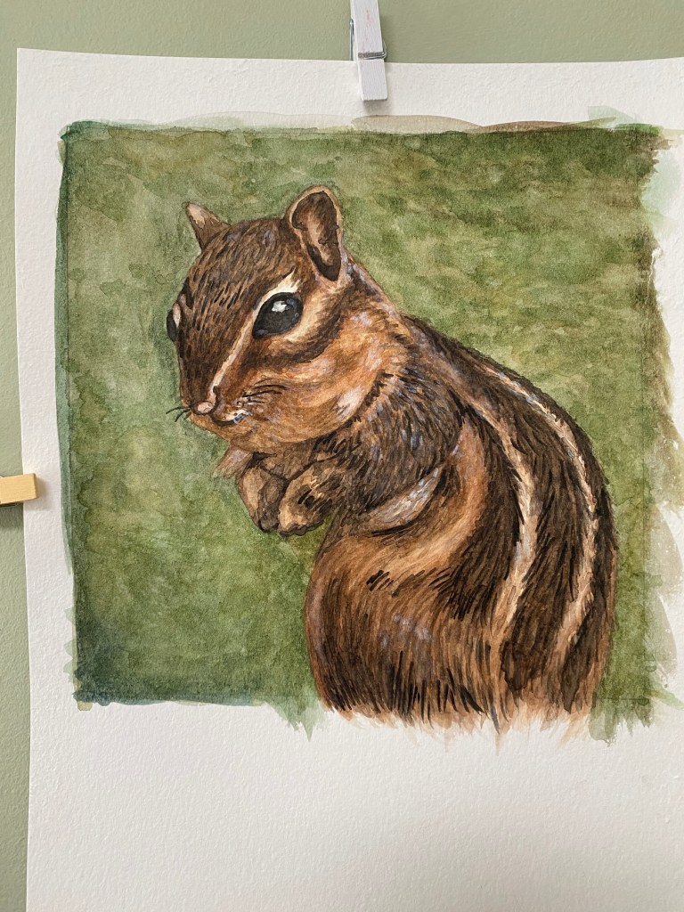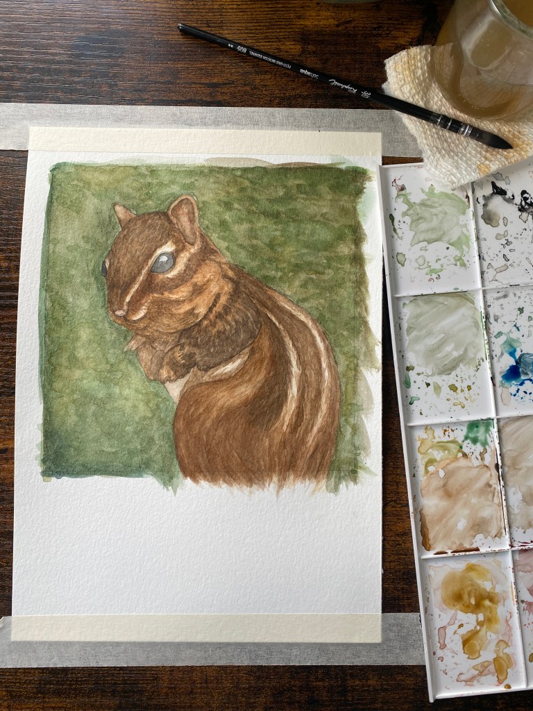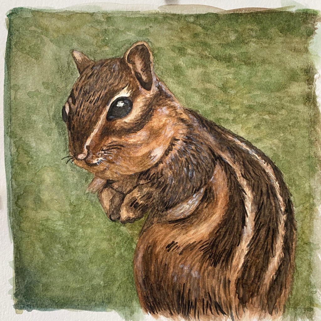Week 3 has been all about the chipmunk! I’ve been steadily layering warm browns and soft textures, working to bring this little Vermont native to life. Watercolor always requires patience, and this week has been a good reminder to trust the process and keep showing up, one brushstroke at a time.