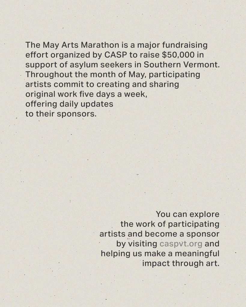 The May Arts Marathon is a creative fundraiser organized by CASP to raise $50,000 in support of asylum seekers building new lives in Southern Vermont. Throughout the month of May, artists like me create and share original artwork five days a week, using our work to inspire community connection and raise critical funds for housing, legal aid, food, and other basic needs.